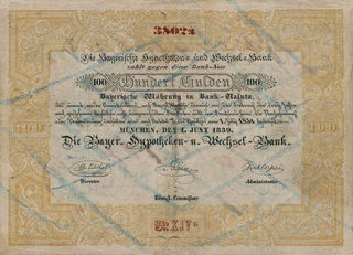 Die Bayerische Hypotheken- und Wechselbank wurde auf Betreiben König Ludwigs I. und auf der Grundlage der von ihm unterzeichneten Bankstatuten vom 18. Juni 1835 am 15. Oktober des gleichen Jahres gegründet. Sie stand unter Aufsicht der Staatsregierung, die durch einen Bankkommissär vertreten wurde. Neben der Königlich Bayerischen Staatsschuldentilgungs-Comission mit ihren Ausgaben von 1866 (bayerisches Staatspapiergeld) hatte allein sie das Recht zur Notenausgabe im Königreich Bayern.