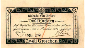 Katharina Depner26. Nov. 20191 Min. LesezeitSammlungenAus der HVB-Stiftung: Blockade-Schein zu 12 Groschen aus Erfurt von 1813