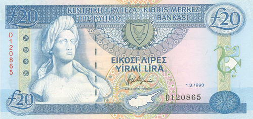 Zypern, Central Bank of Cyprus/Kibris Merkez Bankasi: 20 Pounds/Lires/Lira vom 01.03.1993