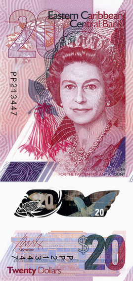 Daneben gibt es noch 5, 10, 50 und 100 Ostkaribische-Dollars-Noten, alle mit Königin Elisabeth II. auf der Vorderseite, gedruckt bei De La Rue in Großbritannien. Die ostkaribischen Dollars sind das offizielle Zahlungsmittel auf den Inseln Anguilla, Antigua und Barbuda, Dominica, Grenada, Montserrat, St. Kitts und Nevis, St. Vincent und den Grenadinen.
