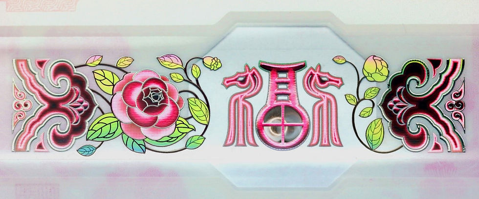 Ein dreidimensionaler, dynamischer Hochglanz-Ringeffekt ist innerhalb des Schriftzeichens „田“ (Feld) am unteren Rand des Schriftzeichens „福“ zu sehen.