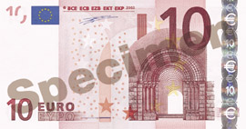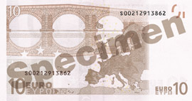 10 Euro, Vorderseite: romanischer Torbogen des frühen Mittelalters; Rückseite: romanische Steinbrücke und Europa-Karte.