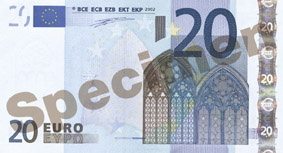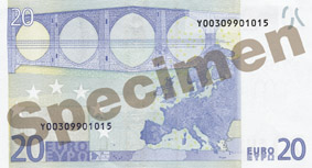 20 Euro, Vorderseite: gotische Spitzbogenfenster;