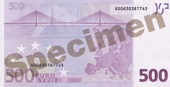 500 Euro, Vorderseite: Architekturstil des ausgehenden 20. Jahrhunderts;