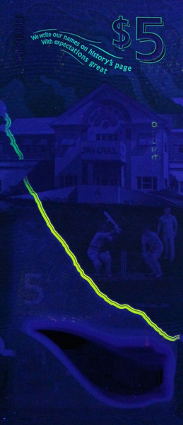 Eines der bekanntesten nationalen Symbole von Barbados ist der zerbrochene Dreizack, der an mehreren Stellen auf jeder Banknote zu sehen ist. Einer davon befindet sich in der Nähe der Mitte jeder Banknote: unter normalem Licht ist er eigentlich unsichtbar, unter UV-Licht leuchtet er jedoch hell auf.
