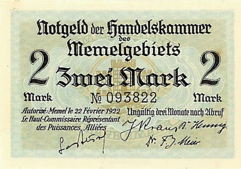 Vom Notgeld der Handelskammer des ostpreußischen Memelgebiets, das ab 1920 nach den Bestimmungen des Versailler Vertrags unter den "Schutz des Völkerbunds" gestellt und französisch verwaltet wurde, sind Sammlern die Notgeldscheine der Handelskammer des Memelgebiets vom 22. Februar 1922 bekannt, die unter den deutschen Nebengebieten katalogisiert und als solche gesammelt werden. Sie waren eigentlich Serienscheine und kein Notgeld, das für den Umlauf bestimmt war.