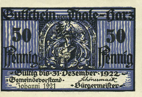 Kann es evtl. sein, dass der untere Schein zu 50 Pfennig von Thale mit Überdruck "Johanni 1921" auf der Rückseite nicht katalogisiert ist?