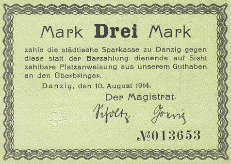 Magistrat: 50 Pf., 1, 2 und 3 Mark 10.8.1914. Diese Scheine sind bei Dießner abgebildet.