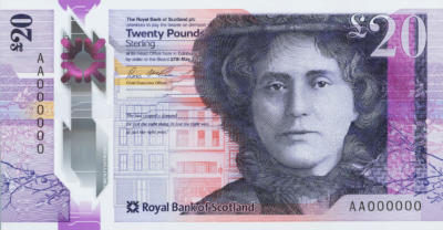 Kate Cranston aus Glasgow zeichnete sich durch eine Reihe von Teestuben in der ganzen Stadt aus. Ihre Vorbild-Stube in der Sauchiehall Street 217 wird von Architekten und Designern aufgrund des von Charles Rennie Mackintosh entworfenen Interieurs gefeiert. Diese Banknote ist die erste schottische 20-Pfund-Banknote, auf deren Vorderseite eine andere Frau als die Königin abgebildet ist. Passend zum Thema "Fabric of Nature" sind auf der Rückseite des neuenZwanzigers eine Abbildung von Eichhörnchen und der Blaubeerfrucht zu finden. Das Design enthält auch Auszüge aus den Werken des schottischen Dichters Mark Alexander Boyd, "Cupid und Venus" aus dem 16. Jahrhundert.