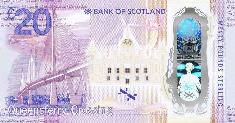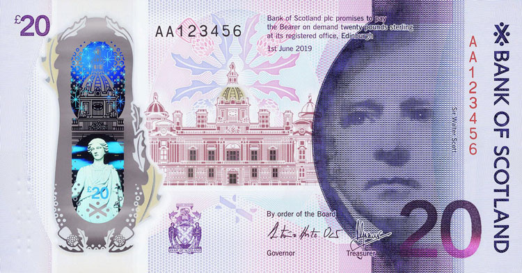 In einer Pressemitteilung vom 7. November 2019 wurden die neuen Banknoten präsentiert und ausführlich beschrieben. Es gibt zwei Versionen des Bank of Scotland-Polymer-20ers, eine normale Umlaufnote und eine limitierte Gedenkbanknote. Beide Versionen zeigen den Schriftsteller und Dichter Sir Walter Scott und The Mound in Edinburgh auf der Vorderseite.